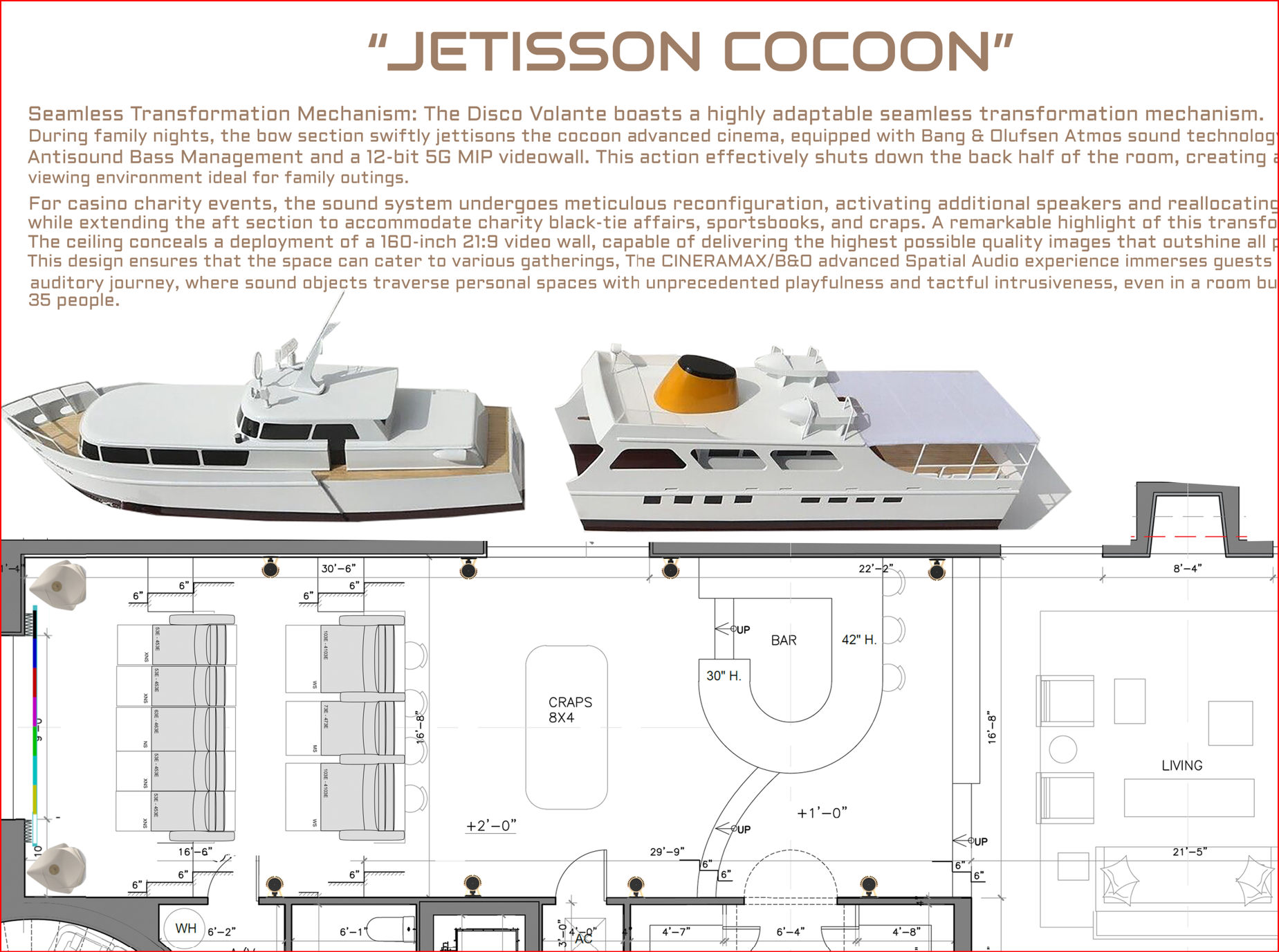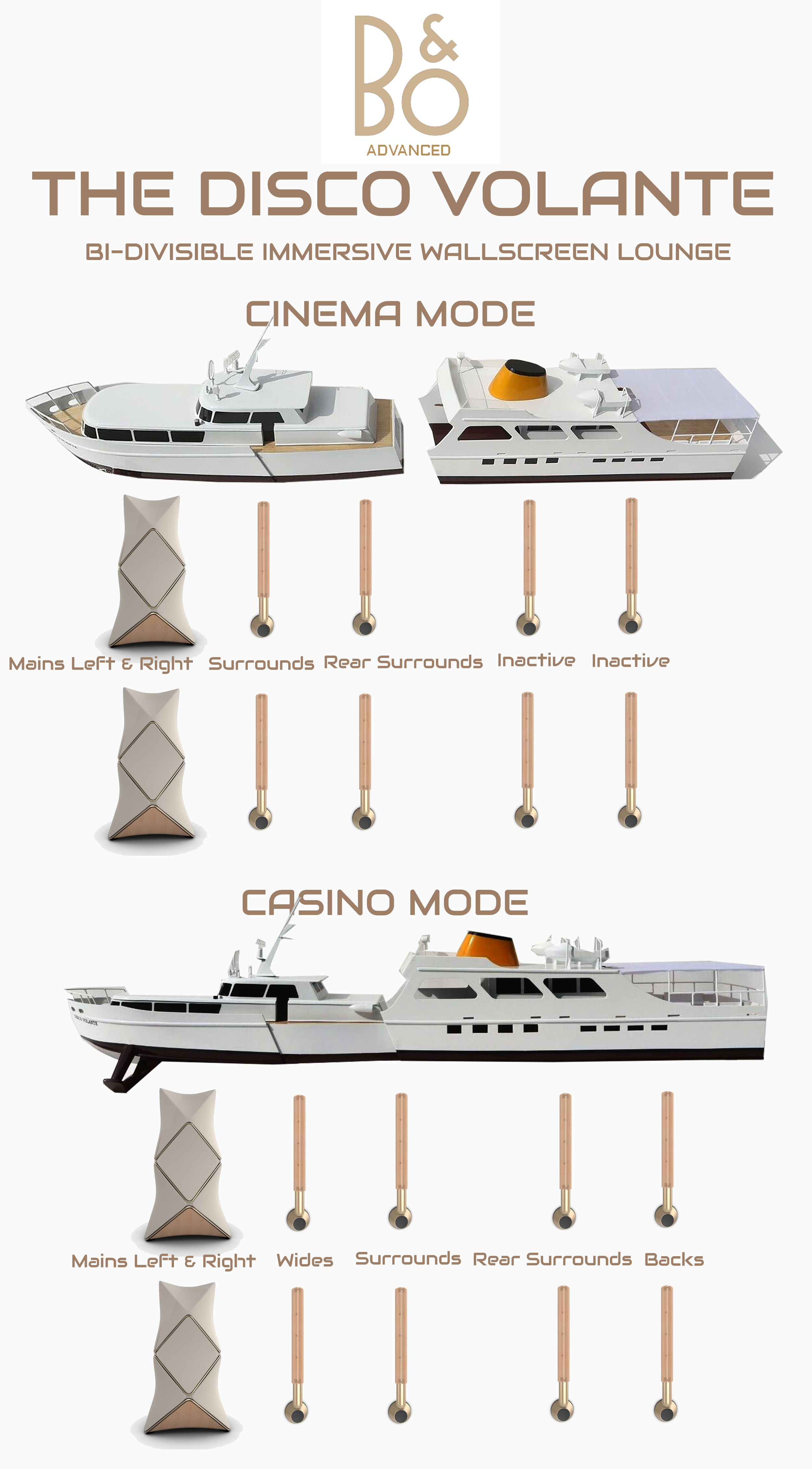The elegant, distinct cantilevered design of the speakers creates a sconce-like detachment from the wall. This architectural choice greatly enhances object audio by optimizing the direct-to-reflected sound ratio, which is crucial for an enveloping audio experience. Offering a substantial improvement over Capitol Studio A, this arrangement employs 16 channel Atmos music to forge a holographic 16-object audio ecosystem. The motorized wood curtains of the Bang & Olufsen BL28 speakers unfurl only when the speaker is active, carefully targeting complete audience coverage from 24 judiciously arrayed locations, ranging from the 'bow cinema cocoon' to the 'special events-only aft speakers.' This setup significantly lowers echo typically linked with in-wall speakers and provides an acoustic quality that eclipses that of any Hollywood music studio. It achieves this without the traditional, restrictive, and dust-accumulating cinema fabric walls, thereby preserving a pristine and open aesthetic. Boasting Florida's premier Dolby Atmos Spatial Audio music library, this venue offers a psychoacoustically sublime 21st-century musical experience on the Intracoastal like no other in the world, fittingly barely 1400 yards from Auric Goldfinger's former pool cabana.