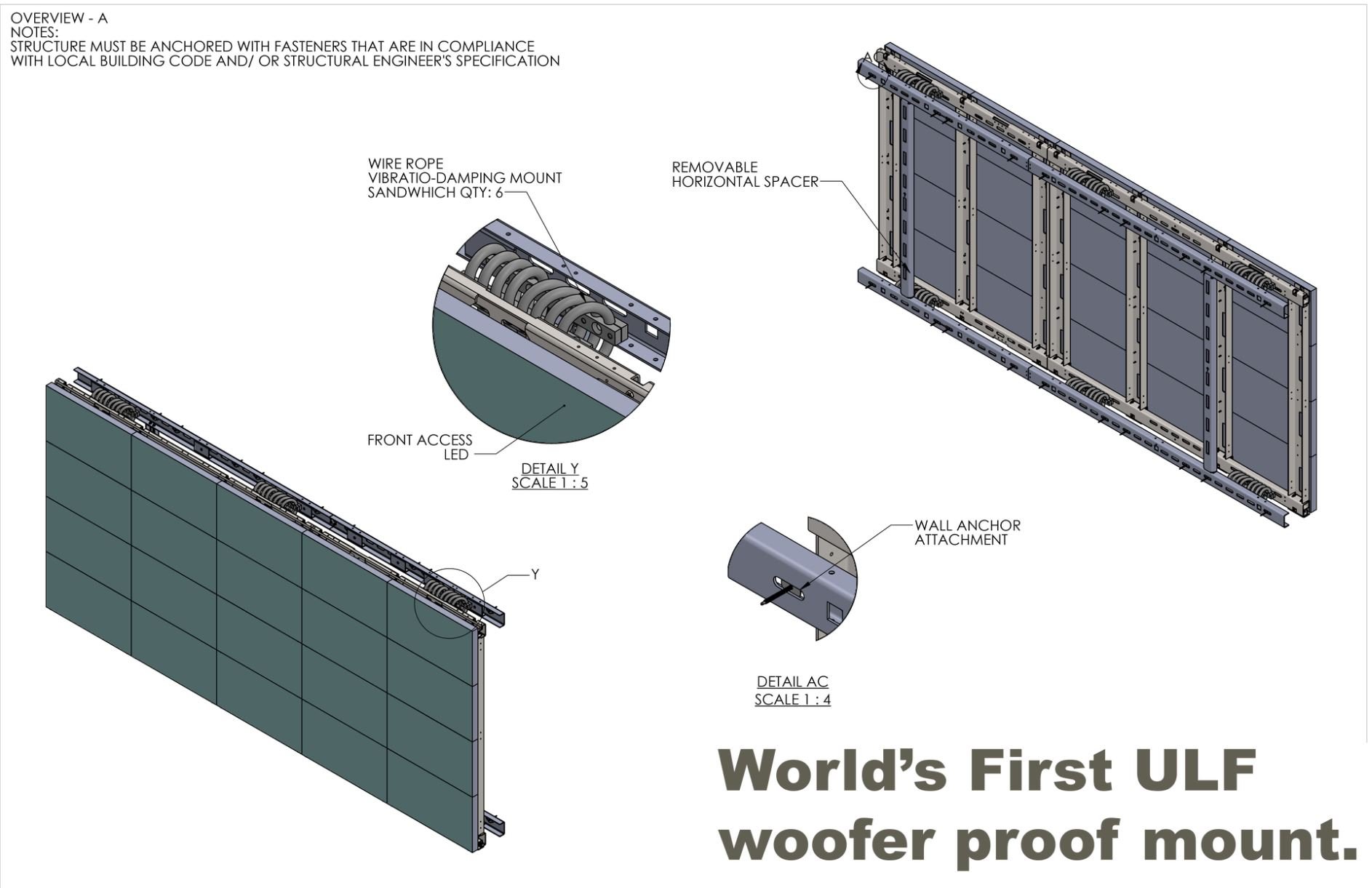 4 subwoofers mounted around a videowall using the standard plywood and z clip mounts have and will continue to fall apart - taking you out of the experience.