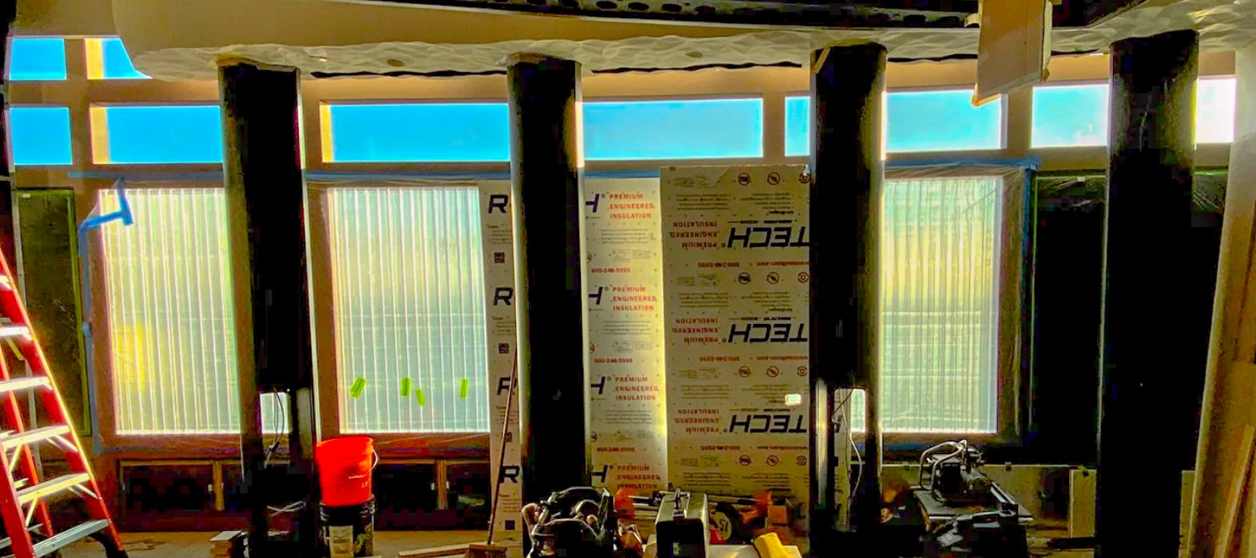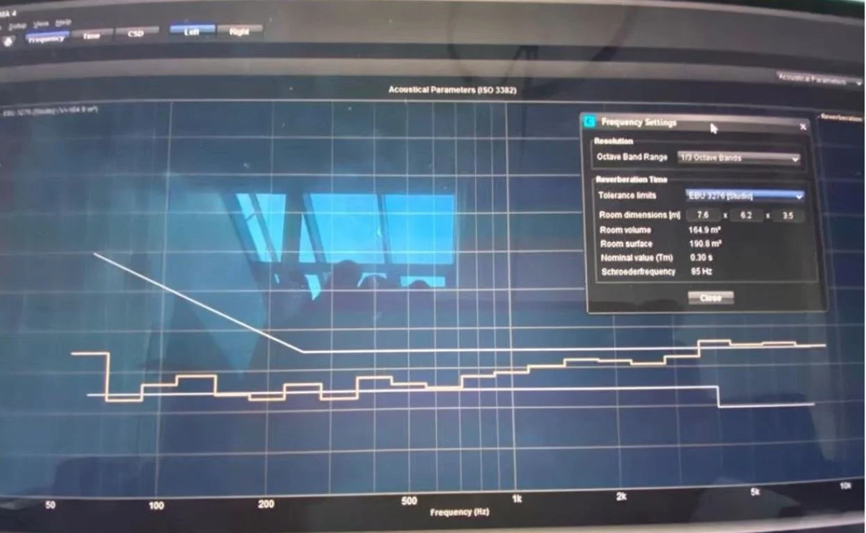 TEMPORARY CARPET SHOWN, CEILING, AND WALL ACOUSTICAL FABRIC APPLICATION IS PENDING ADDITIONAL ACOUSTICAL WORK BEFORE CLOSING.
